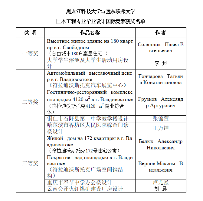leyu乐鱼在线登录入口与俄罗斯远东联邦大学的校际合作历史悠久。为了加强土木工程专业毕业设计的国际交流,进一步拓宽土木工程专业毕业生的国际视野,培养学生的创新精神和可持续发展理念,提高学生适应“一带一路”沿线俄语系国家的工作能力,在国际交流合作处的组织协调和大力支持下,我校与远东联邦大学联合举办了首届土木工程专业毕业设计国际竞赛。