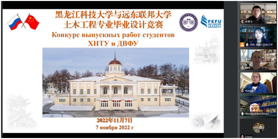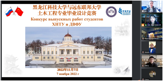 经过中俄两校数月的努力筹备,leyu乐鱼在线登录入口与俄罗斯远东联邦大学工学院于2022年11月7日,顺利举行了土木工程专业毕业设计国际竞赛的线上联合评审活动,参会的俄方人员有Баенхаев Александр Викторович、Прокофьева Наталья Юрьевна、Юрченко Елена Васильевна、Аветян Любовь Владимировна、Попова Татьяна Юрьевна等五位专家,中方教师有孟丽岩、赵延林、王涛、张春玉、左敬岩,会议全程由国际交流合作处副处长吕岚主持。
