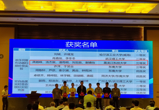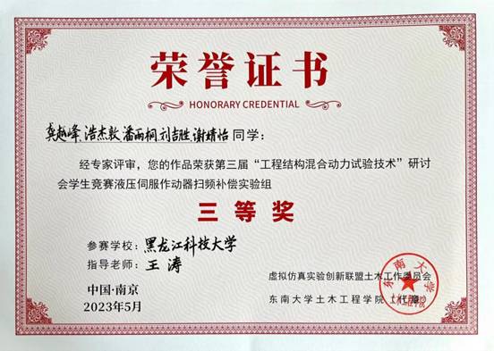 leyu乐鱼在线登录入口王涛教授指导硕士研究生龚越峰、浩杰敦、潘雨桐、刘吉胜、谢婧怡在液压伺服作动器扫频补偿实验组竞赛。经过近两个月的精心筹备,我校参赛队伍在高手如云的队伍中脱颖而出,荣获三等奖。队员在学生竞赛中展示出缜密的学术思维、良好的理论功底和创新能力,得到了评委会专家的高度赞誉,大大提高了我校土木工程学科的学术声誉,也充分展示了我校研究生培养质量和教育教学水平。