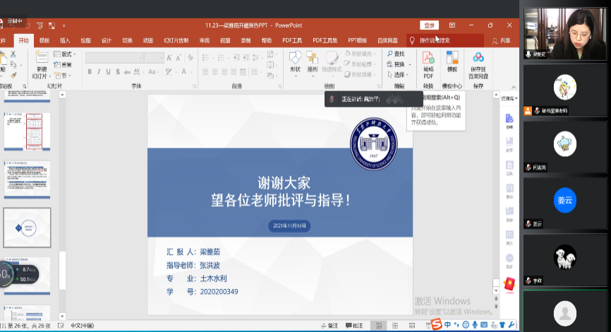 答辩过程中,先由研究生自述学位论文的选题、研究目的与意义、国内外研究现状、研究内容及预期时间进程,之后,在组长组织下,答辩委员会成员提出问题,指出研究内容与研究方法的可行性及开题报告中存在的问题,并提出改进方向以及可进一步完善的中肯意见。各位同学就专家组提出的问题及修改意见进行了认真回答和记录。答辩环节结束后,线上答辩的学生退出会议室、线下答辩的学生退出答辩教室,由答辩委员会对开题答辩通过情况投票表决。