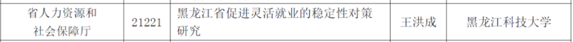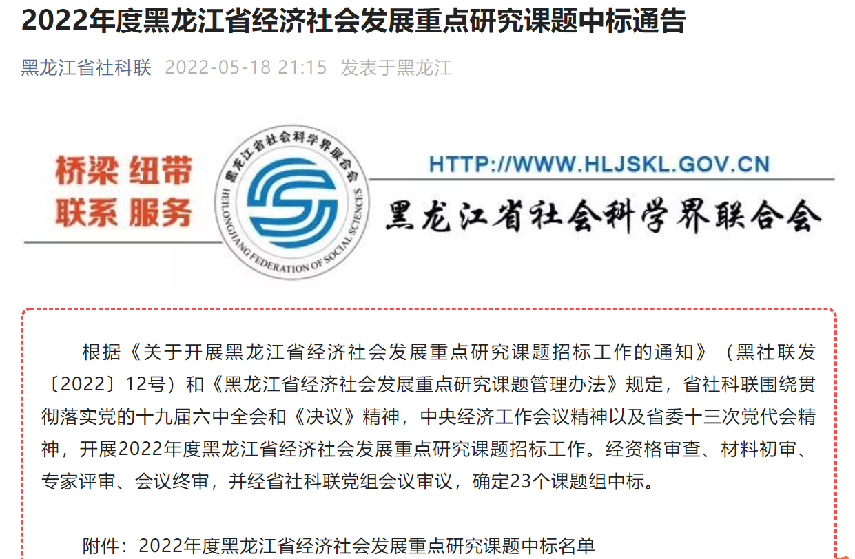 2022年5月18日,黑龙江省社会科学界联合会公示了2022年度黑龙江省经济社会发展重点研究课题中标名单,全省共23个课题中标,其中leyu乐鱼官网王洪成博士主持申报的课题《黑龙江省促进灵活就业的稳定性对策研究》经过资格审查、材料初评、专家评审、会议终审,并经省社科联党组会议审查,成功中标。本次课题我校共中标2项,分别是leyu乐鱼在线登录入口、管理学院。